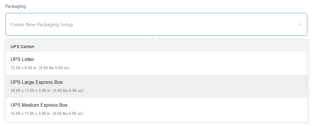 - Selecting your packaging type: When creating labels, you'll need to select the particular UPS Express box or envelope you're using from the Type of Packaging drop-down.